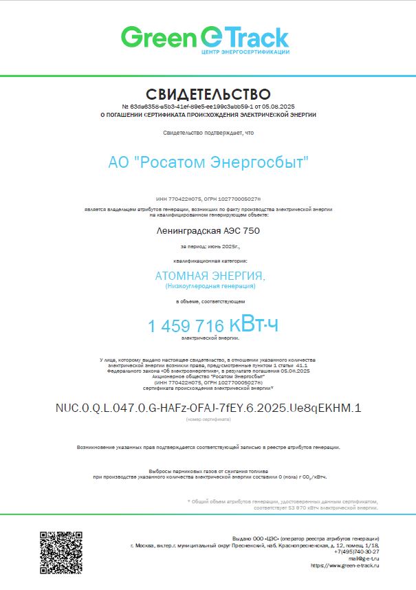 АО «Росатом Энергосбыт» обеспечивает полное соответствие законодательству при работе с сертификатами происхождения электроэнергии и подтверждает вашу приверженность устойчивому развитию.