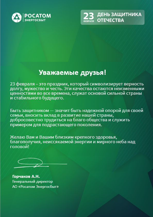 Поздравление генерального директора АО "Росатом Энергосбыт" Алексея Горчакова с 23 февраля!