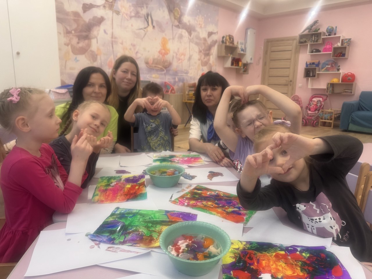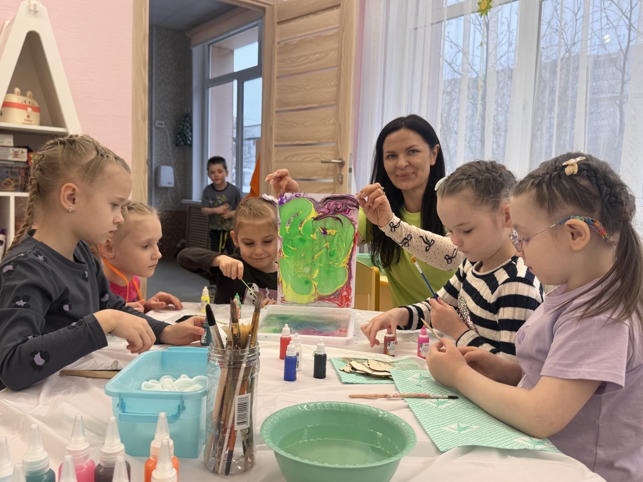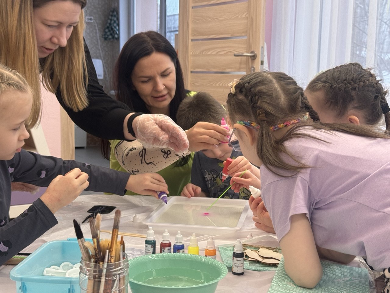 Мероприятие прошло в тёплой и дружелюбной атмосфере, где каждый ребенок мог проявить свою индивидуальность и раскрыть творческий потенциал. Волонтеры подготовили разнообразные материалы: краски, карандаши, пластилин, аппликации и другие художественные принадлежности. В процессе занятия дети вместе с волонтерами создавали яркие картины на воде, поделки и декоративные изделия из застывающего геля, что не только развивает их мелкую моторику и фантазию, но и способствует укреплению уверенности в себе, учат коммуникациям со взрослыми.