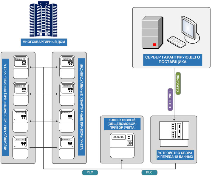 В случае, если МКД имеет небольшое количество точек учёта, и находится в зоне уверенного приёма сотовой связи, по согласованию с гарантирующим поставщиком могут быть использованы приборы учёта со встроенным GPRS-модемом. Однако, такое решение не рекомендуется в связи с высокой стоимостью создания и эксплуатации.